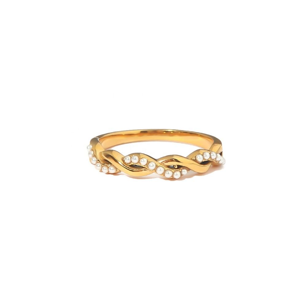 Anillo dorado de diseño entrelazado con delicadas perlas, elegante y femenino, perfecto para usar a diario o en ocasiones especiales.