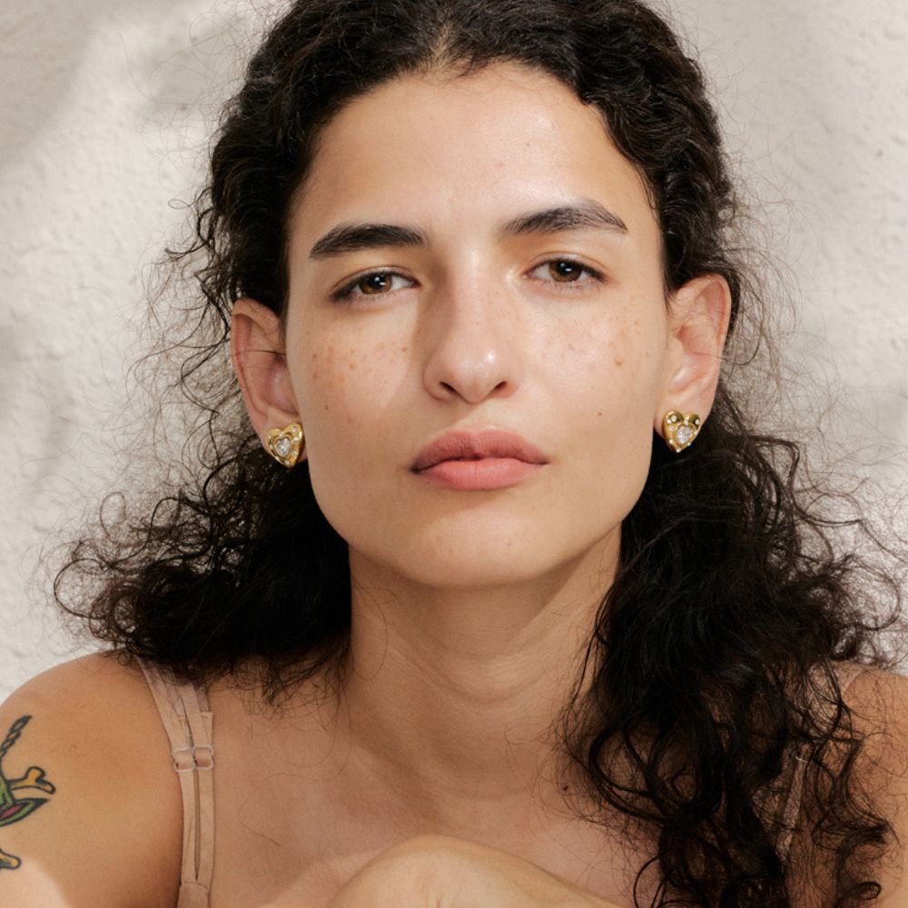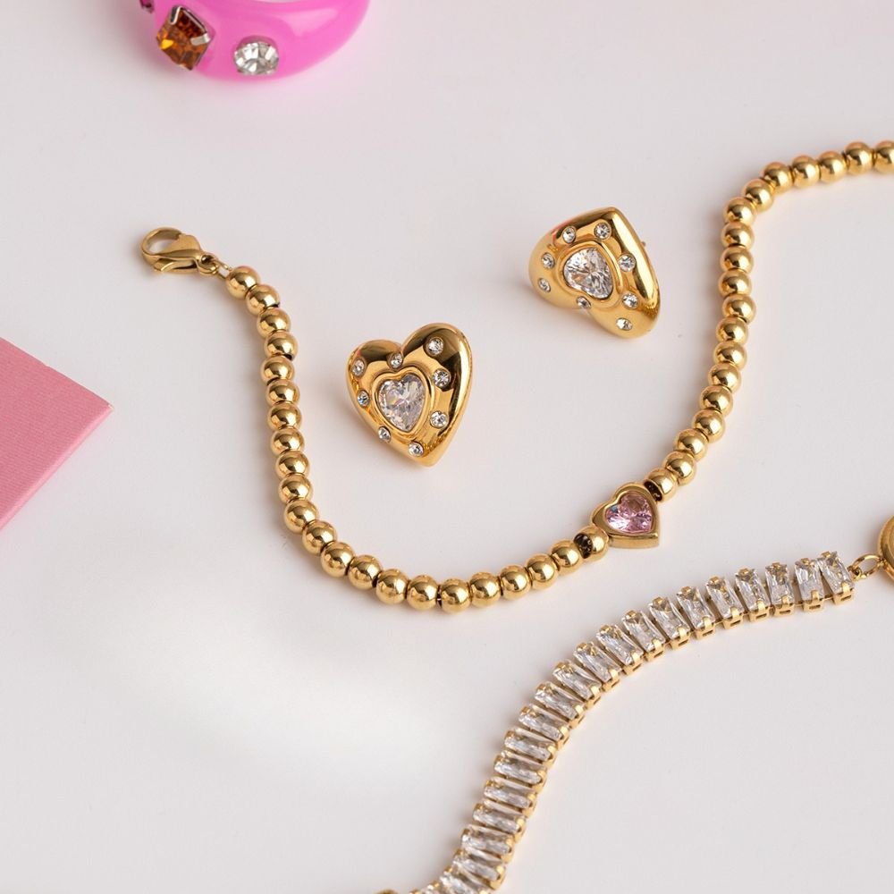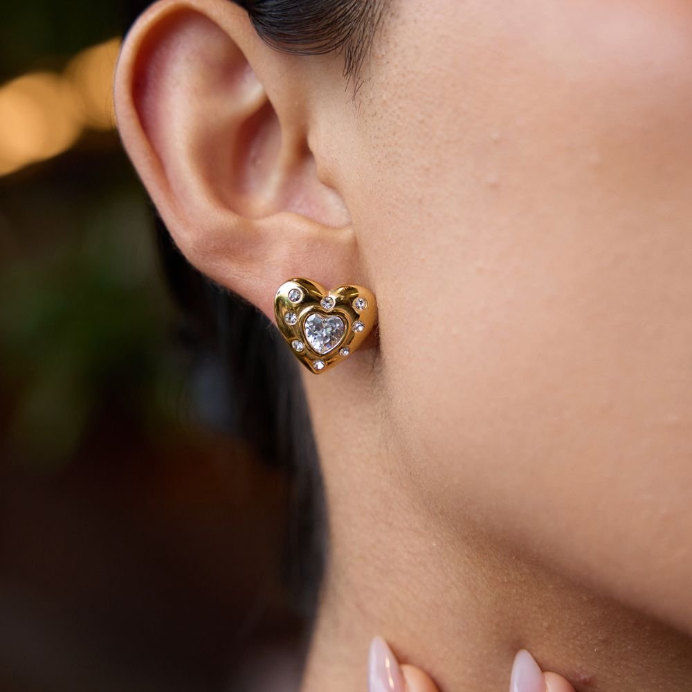 Estos aretes en forma de corazón destacan por su diseño encantador y sofisticado, realzado con brillantes incrustaciones que aportan un destello sutil y elegante. Su acabado dorado pulido envuelve una piedra central en forma de corazón, creando una pieza femenina y atemporal que simboliza amor y estilo. Ideales para añadir un toque romántico a cualquier look, estos aretes son perfectos tanto para el uso diario como para ocasiones especiales.