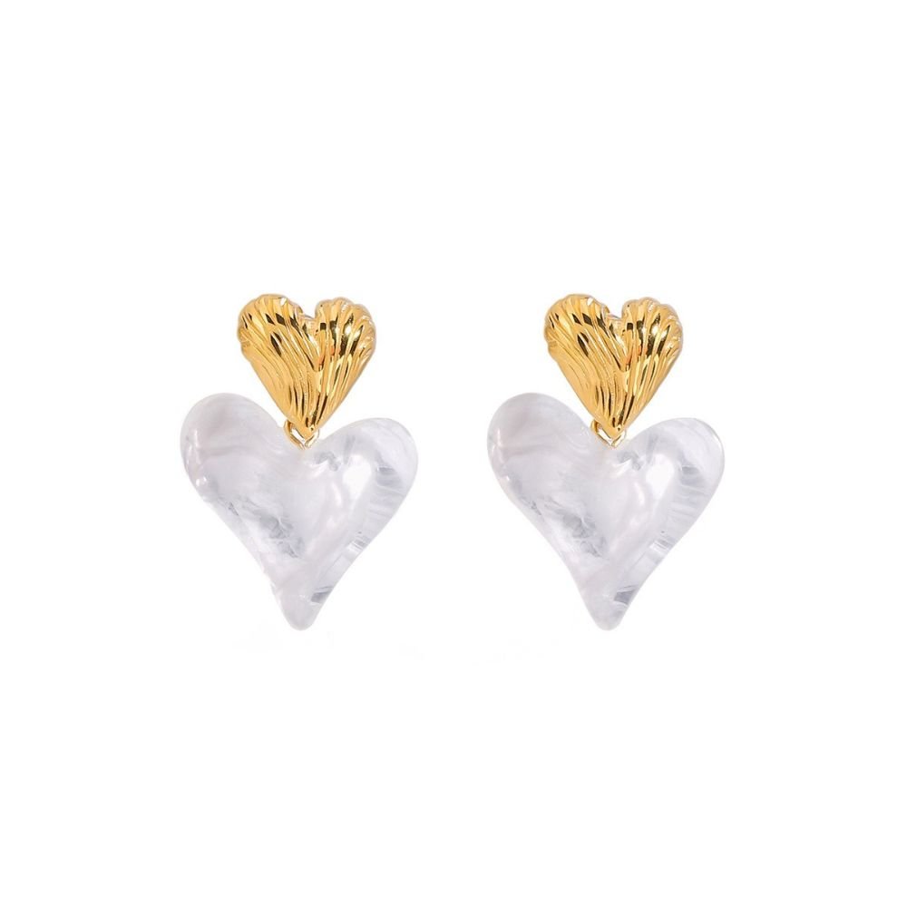 Estos aretes combinan delicadeza y sofisticación en un diseño romántico de doble corazón. La parte superior en acabado dorado presenta un corazón texturizado que aporta brillo y elegancia, mientras que el corazón inferior translúcido, de apariencia marmoleada, añade un toque moderno y etéreo. La armonía entre ambos materiales crea una pieza ligera, femenina y muy versátil. Ideales para realzar cualquier look, desde outfits casuales hasta estilos más elegantes, estos aretes son perfectos para quienes buscan un accesorio dulce, moderno y con personalidad.