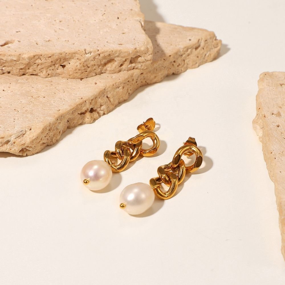 Estos aretes combinan a la perfección la fuerza del diseño moderno con la delicadeza clásica de la perla. Presentan una estructura de eslabones dorados entrelazados, de acabado pulido y brillante, que aporta carácter y sofisticación. En la parte inferior, una perla de tono suave añade un contraste elegante y femenino, creando una pieza equilibrada y atemporal. Ideales para elevar cualquier look, desde uno casual chic hasta un outfit más formal, estos aretes son el complemento perfecto para quienes buscan estilo, distinción y versatilidad.