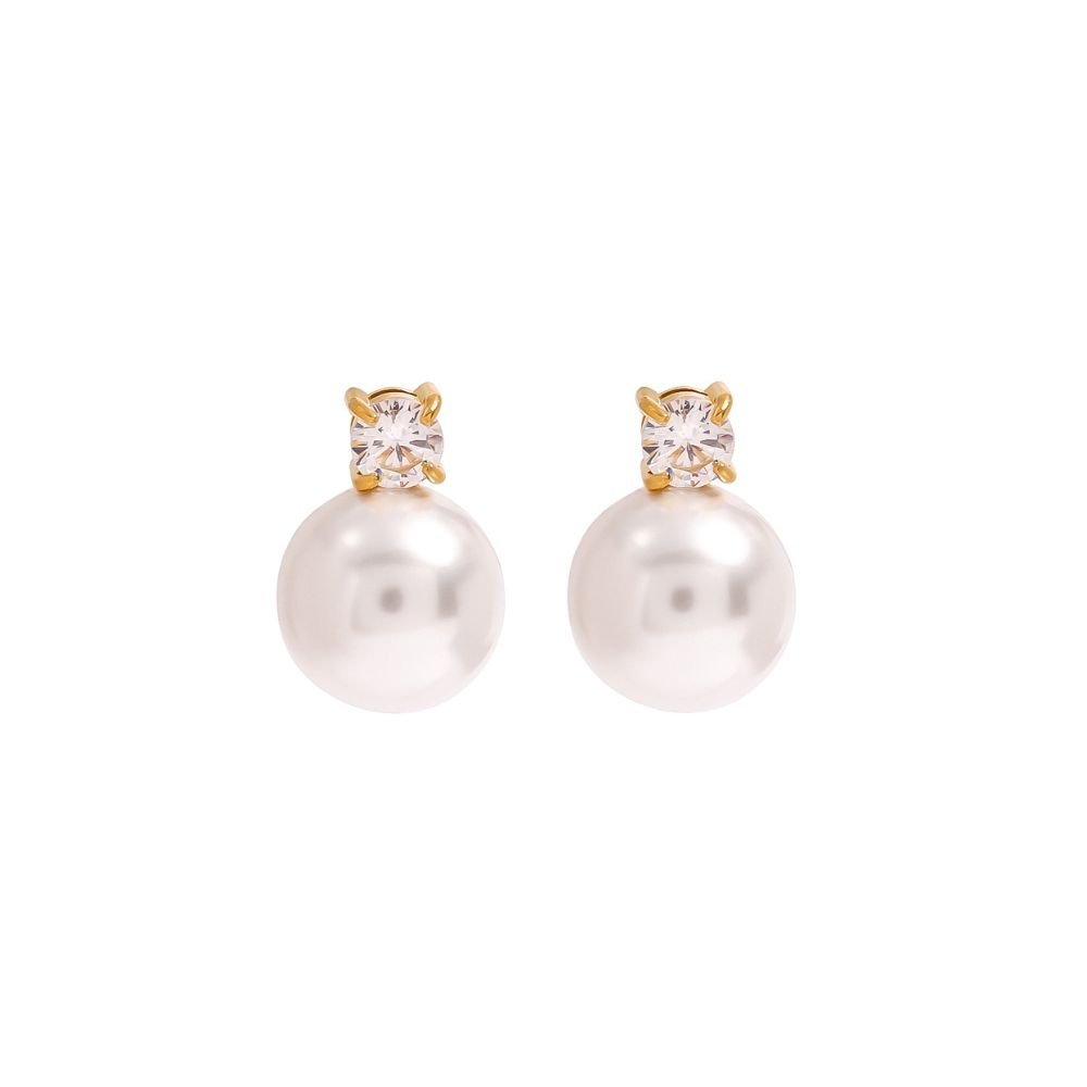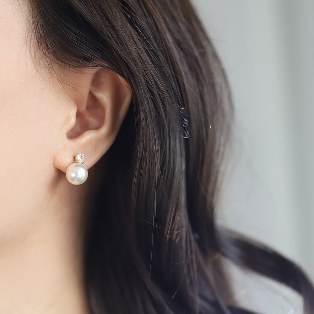 Aretes con perla y detalle de cristal en engaste dorado. Un diseño clásico y elegante que aporta luz y sofisticación.