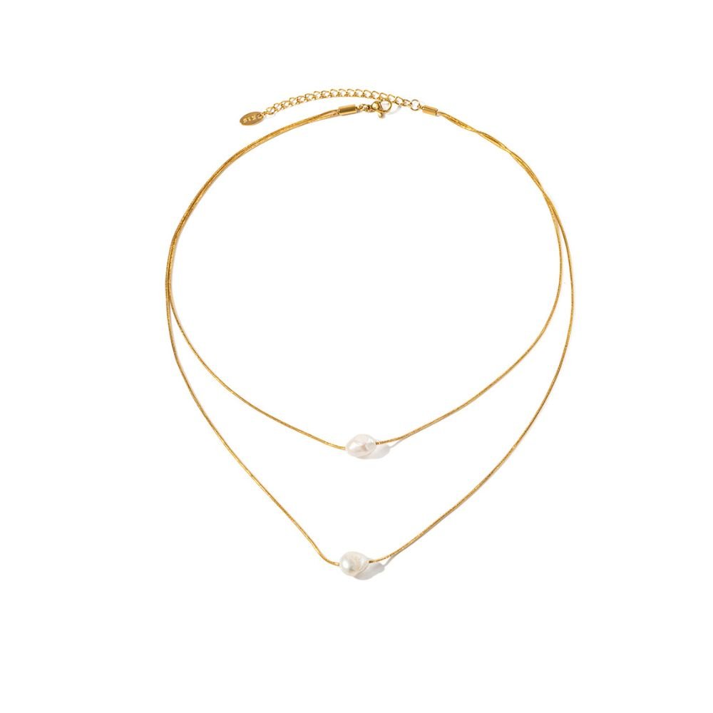 Collar dorado de doble cadena con perlas, elegante y delicado.