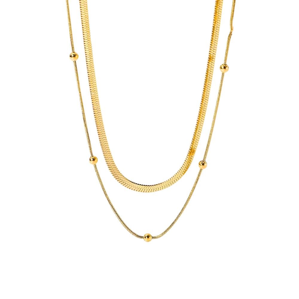 Este sofisticado collar dorado presenta un diseño de doble capa que aporta profundidad y estilo a la joya. Combina una cadena tipo espiga con una cadena fina decorada con pequeñas esferas doradas distribuidas de forma armoniosa, creando un equilibrio perfecto entre elegancia y modernidad. Su acabado brillante resalta la delicadeza del diseño, convirtiéndolo en un accesorio versátil que puede usarse tanto de día como de noche. Ideal para llevar solo o combinado con otros collares, esta pieza es perfecta para quienes buscan un toque refinado y actual en su look diario.
