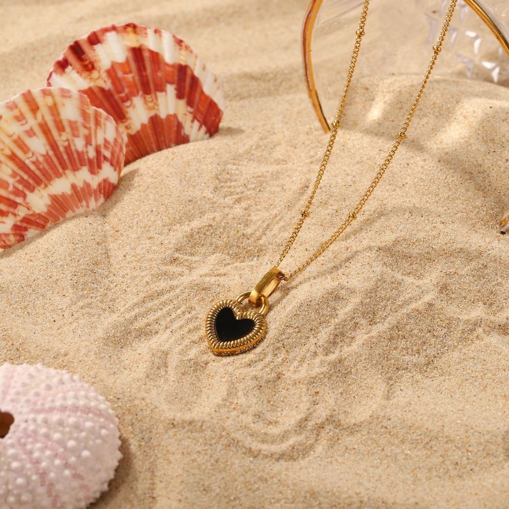 Collar dorado con dije de corazón negro y el reverso es un corazon blanco , un diseño elegante y sofisticado que aporta un toque distintivo y moderno.