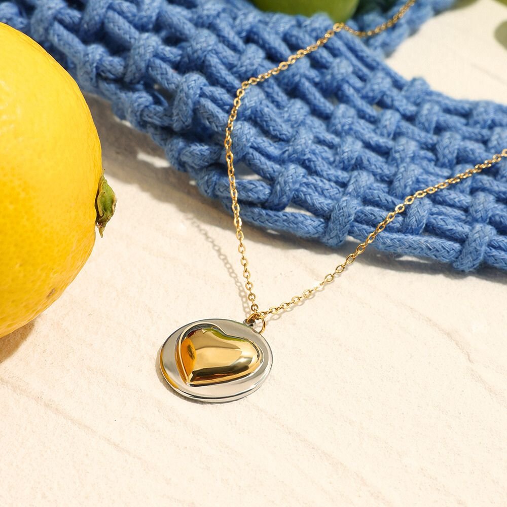 Este collar destaca por su diseño sutil y lleno de significado. Está elaborado con una fina cadena dorada que aporta ligereza y sofisticación, acompañada de un delicado colgante circular con un corazón central en tono dorado, enmarcado por un elegante acabado plateado que crea un contraste moderno y armonioso.
