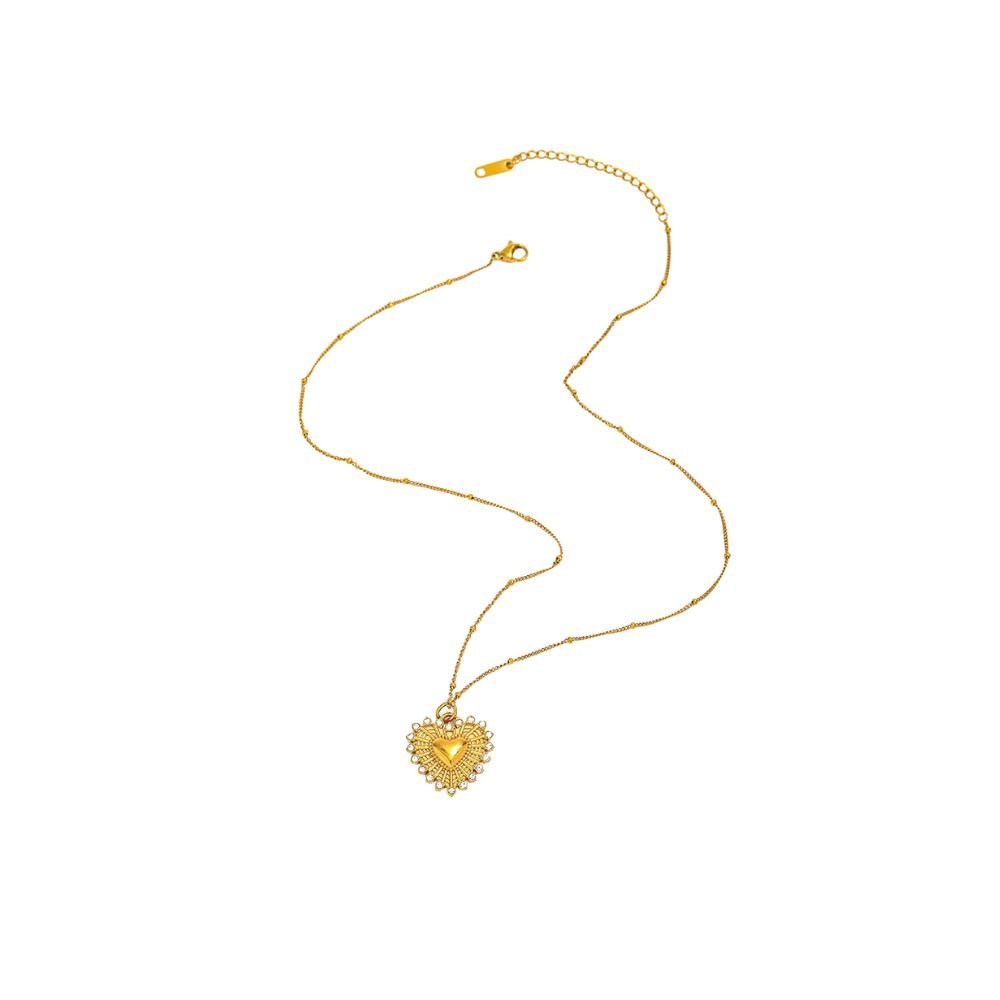 Este hermoso collar dorado destaca por su impactante dije en forma de corazón, cuidadosamente diseñado con un centro liso y brillante que refleja elegancia y armonía. Alrededor del corazón, delicados detalles y pequeños destellos crean un efecto radiante que aporta luz y sofisticación a la pieza.