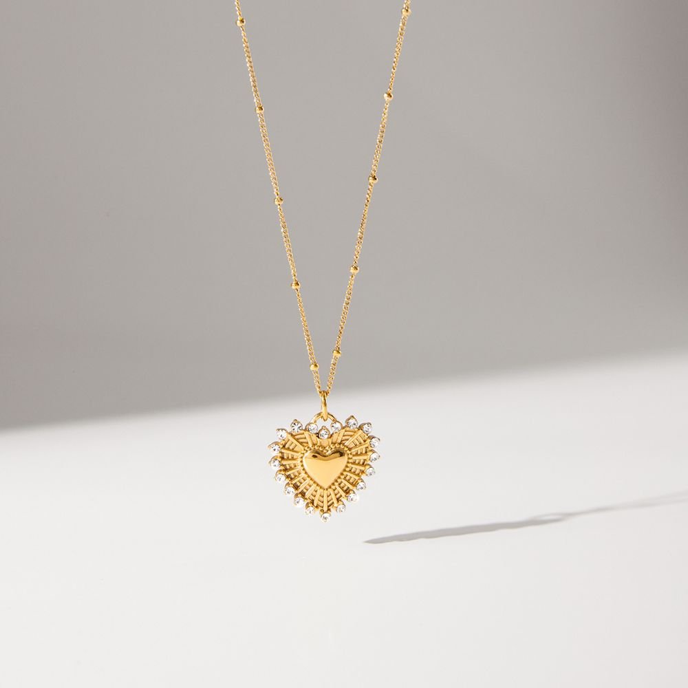 Collar dorado con elegante dije de corazón central rodeado de destellos, un diseño sofisticado que simboliza amor, luz y protección. Ideal para realzar cualquier look.