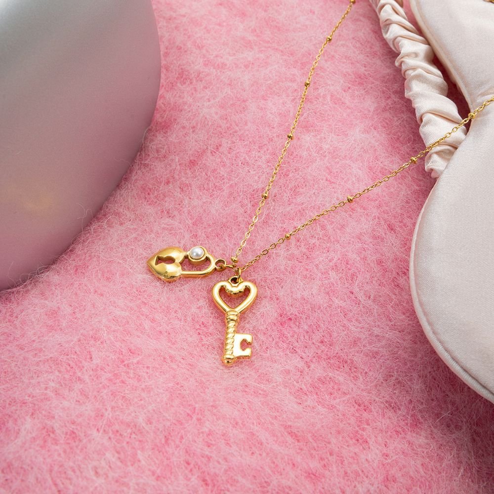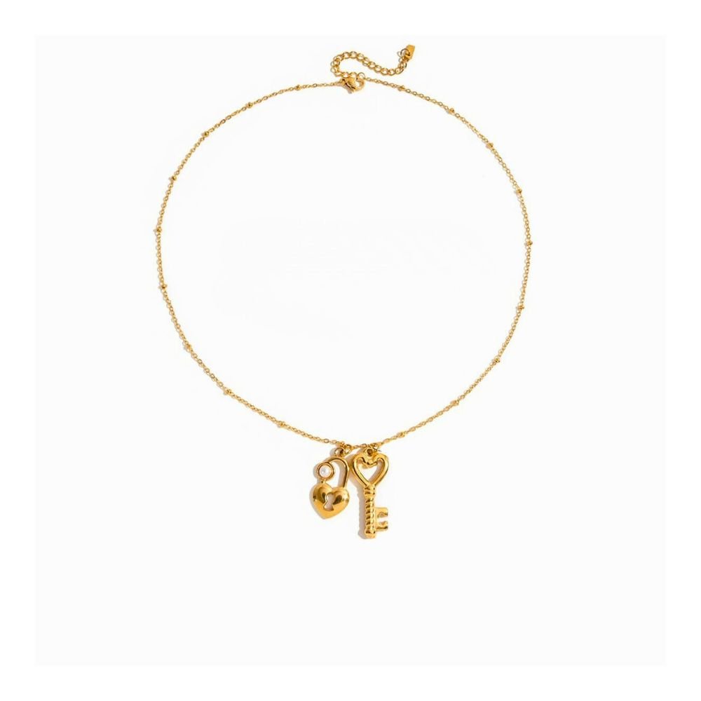 Collar dorado con delicados dijes de corazón y llave, símbolo de amor, unión y nuevos comienzos. Un diseño romántico y elegante, perfecto para llevar todos los días o regalar a alguien especial.