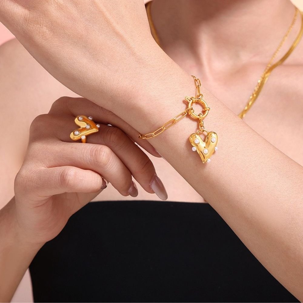 Pulsera dorada de eslabones alargados con un delicado dije central en forma de corazón adornado con cristales brillantes. Su diseño combina la fuerza de la cadena con la feminidad del corazón, creando una pieza equilibrada, elegante y moderna. Incorpora cierre con cadena de extensión ajustable para un ajuste cómodo y seguro. Ideal para aportar un toque romántico y sofisticado a cualquier look, ya sea casual o de ocasión especial.