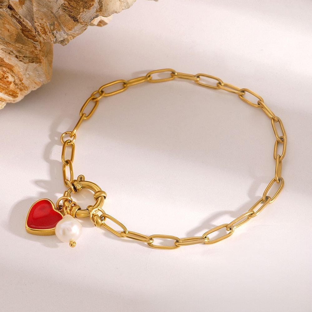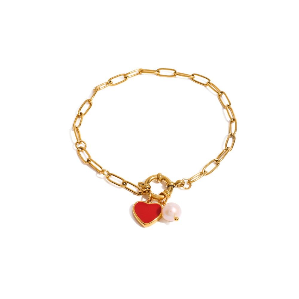 Pulsera dorada de eslabones con corazón rojo y detalle de perla, moderna y elegante.
